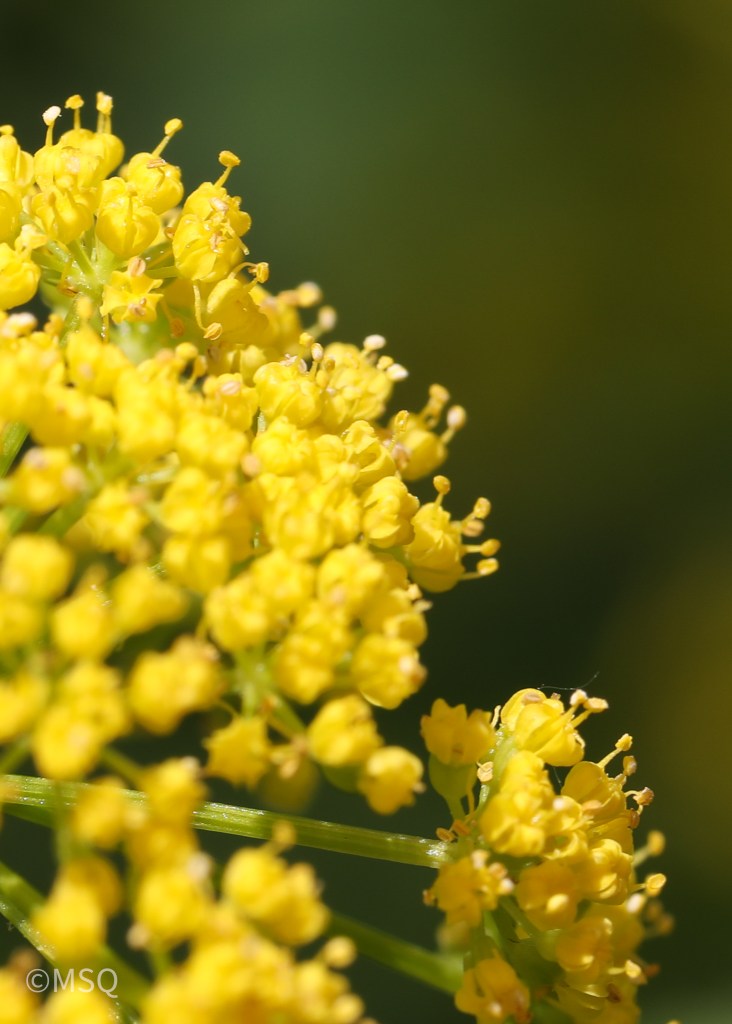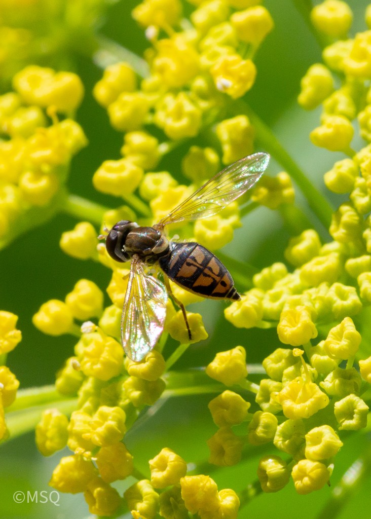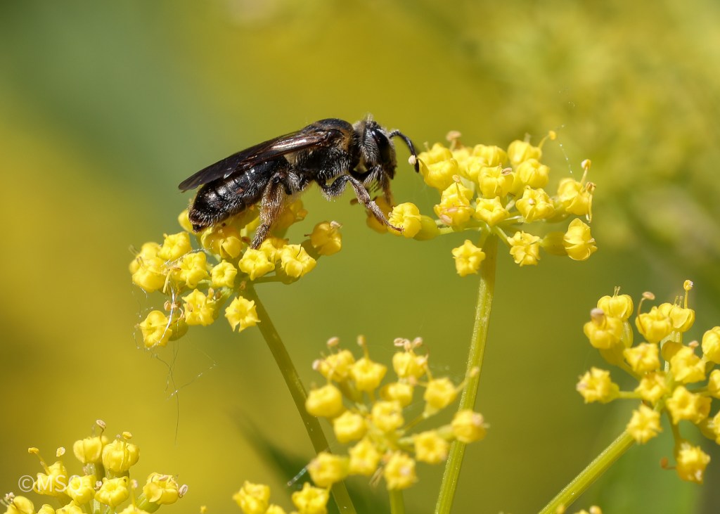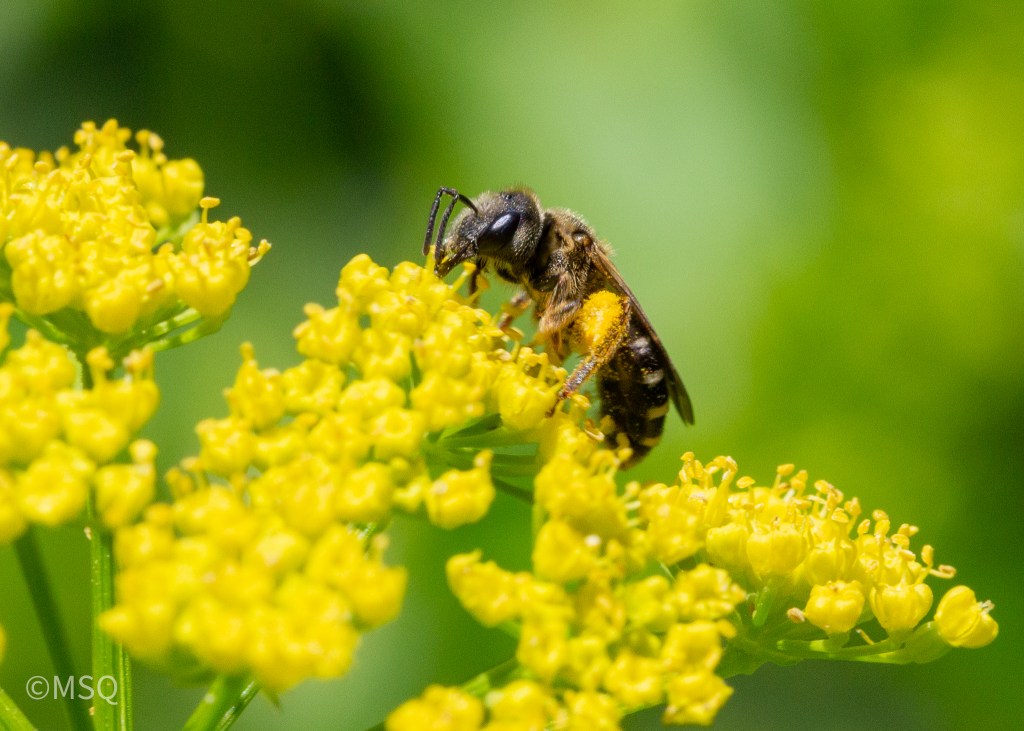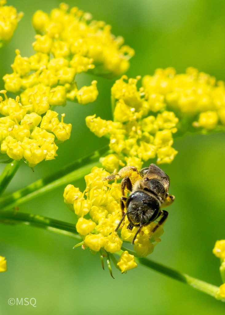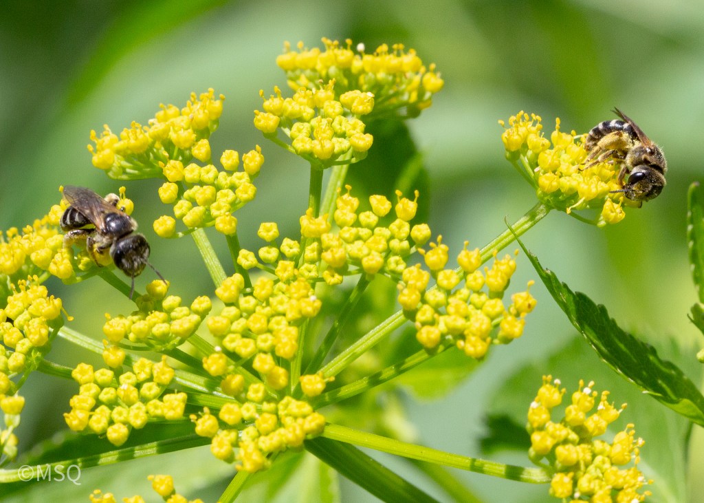Short- and long-tongued bees crowd around it. The short-tongued bees include Hylaeus (Yellow-faced bees), Andrenid bees, Ceratina (small carpenter bees), Osmia (Mason bees),and Halictid bees including Lasioglossum and green metallic bees. Golden Alexanders has its own specialist bee (oligolege). Like many oligoleges, Andrena ziziae is an Andrenid bee. While most visitors gather nectar from Golden Alexanders, A. ziziae also collects pollen for its larva. Long-tongued bees visit Zizia and include bumblebees and cuckoo bees.