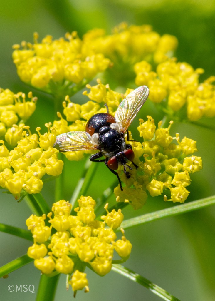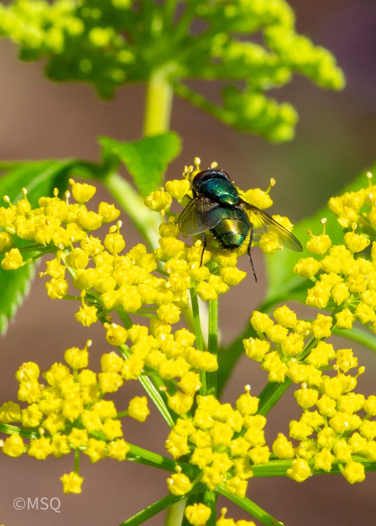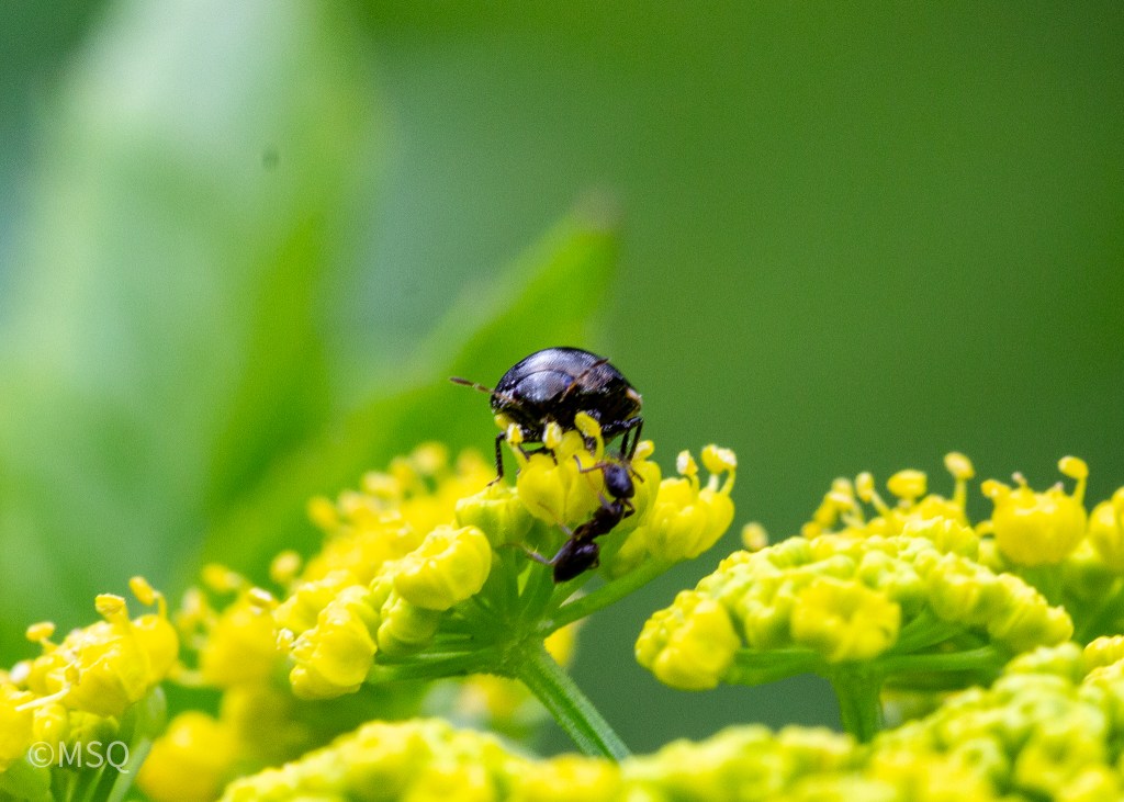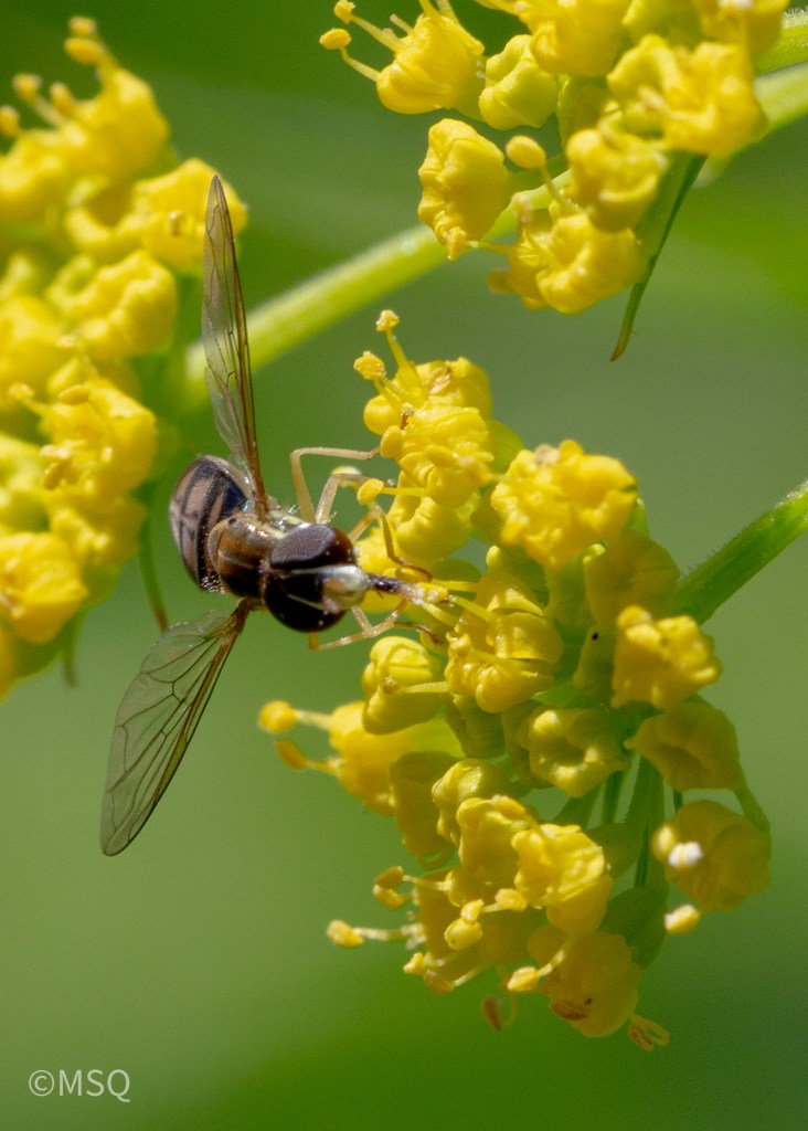 In addition to wasps and bees, flies, beetles, and butterflies use Zizia aurea. Empididae, also called Dagger or Balloon flies, visit Zizia. These small- to medium-sized flies hunt other insects and are important natural and biological controls. Their larva lives in moist soil, rotten wood, dung or in aquatic habitats. The larva also seems to be predatory on other arthropod larva especially Diptera. Diptera is a large group of flies including houseflies, blow flies, mosquitoes, gnats, black flies, midges, fruit flies, and agricultural pests.9,10