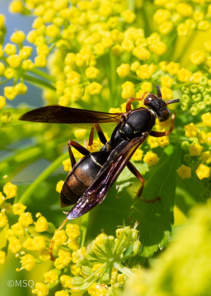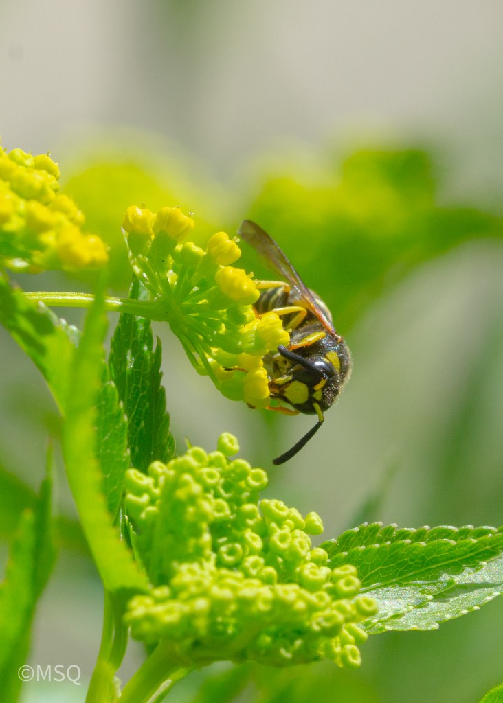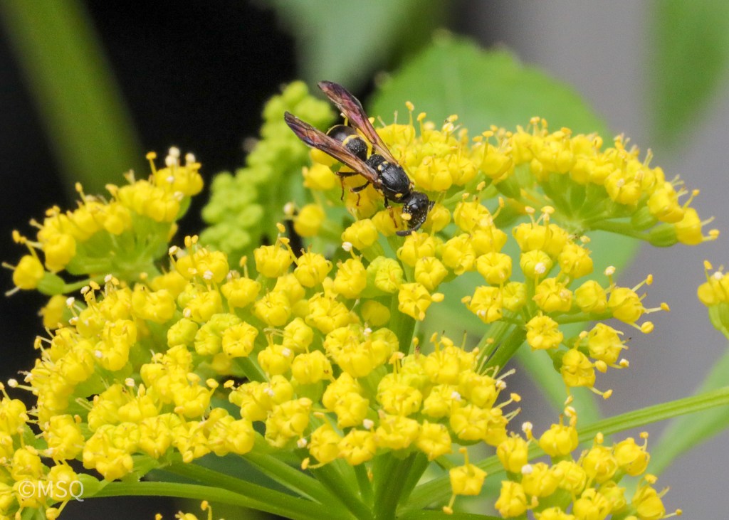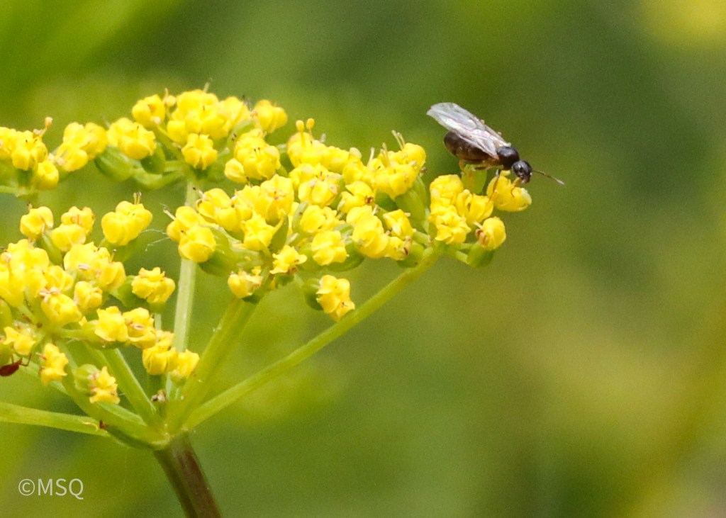 Zizia aurea is a big favorite of wasps with their short tongues. Many different types harvest its nectar including both predatory and parasitoid wasps. These include Chalcidoidea, Cynipoidea, Eumininae, Aplopus spp. (Spider wasps), Ichneumonidae and Crabroninea.3,4,5