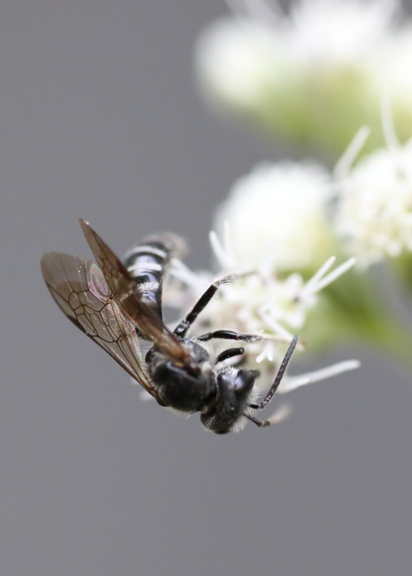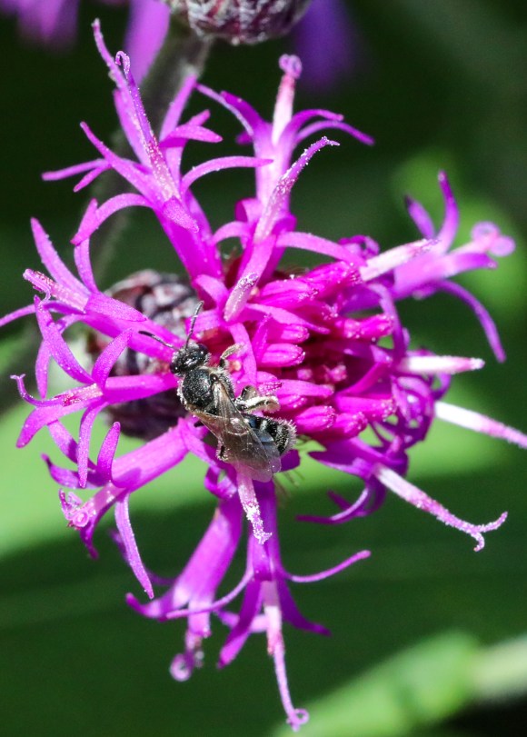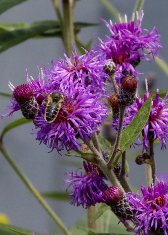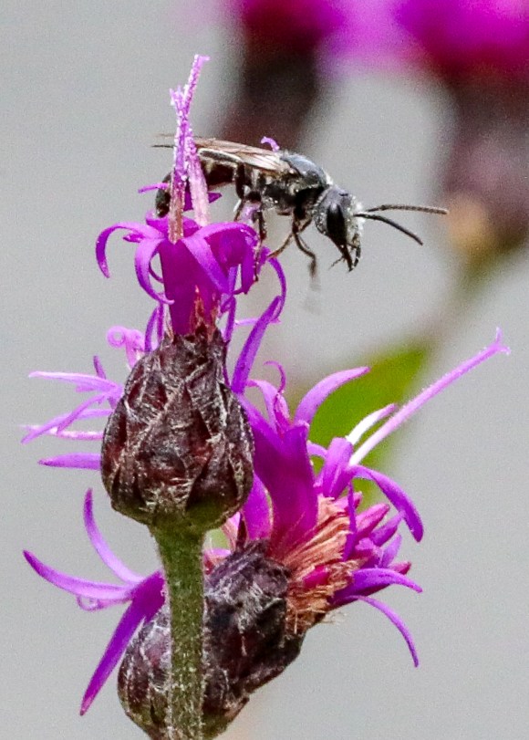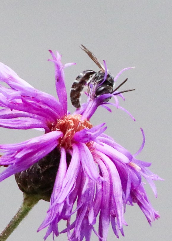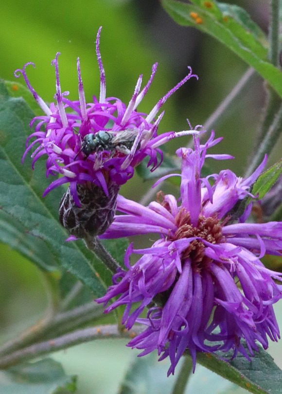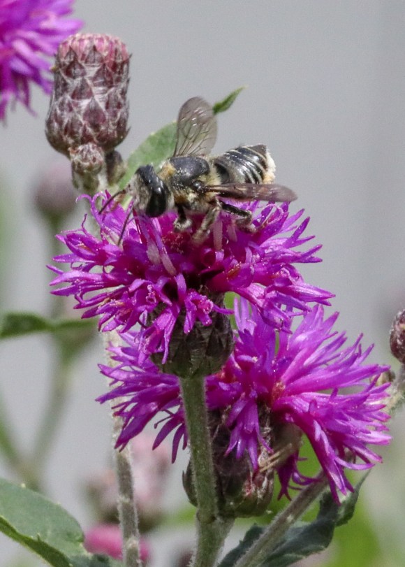 Melissodes denticulata flies from summer to early fall emerging in time for Ironweed’s bloom period. They carry pollen on a hairy structure on their back legs called a scopa. Look for Ironweed’s white pollen on their scopa, bodies and faces. 1,2