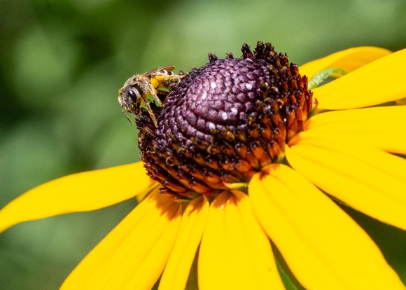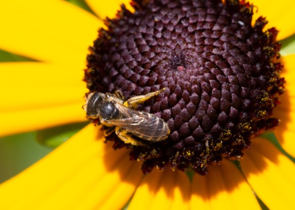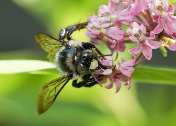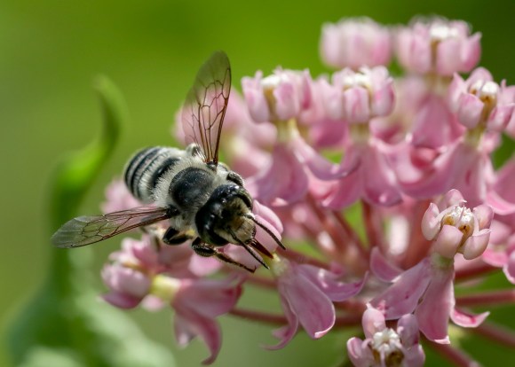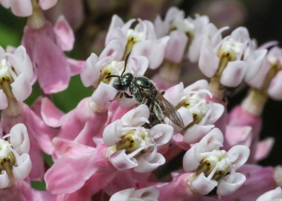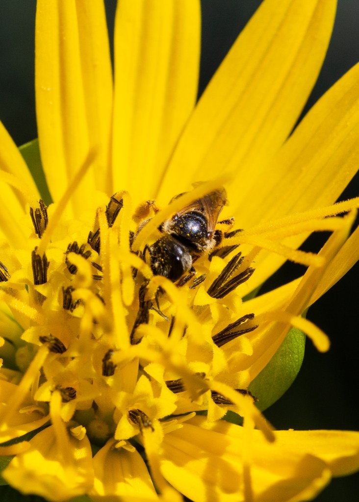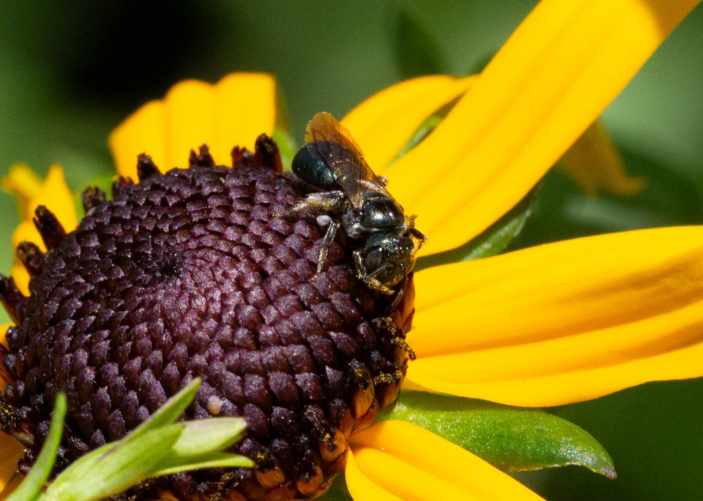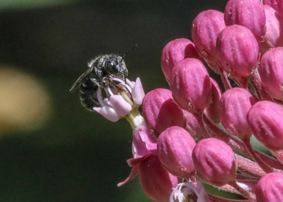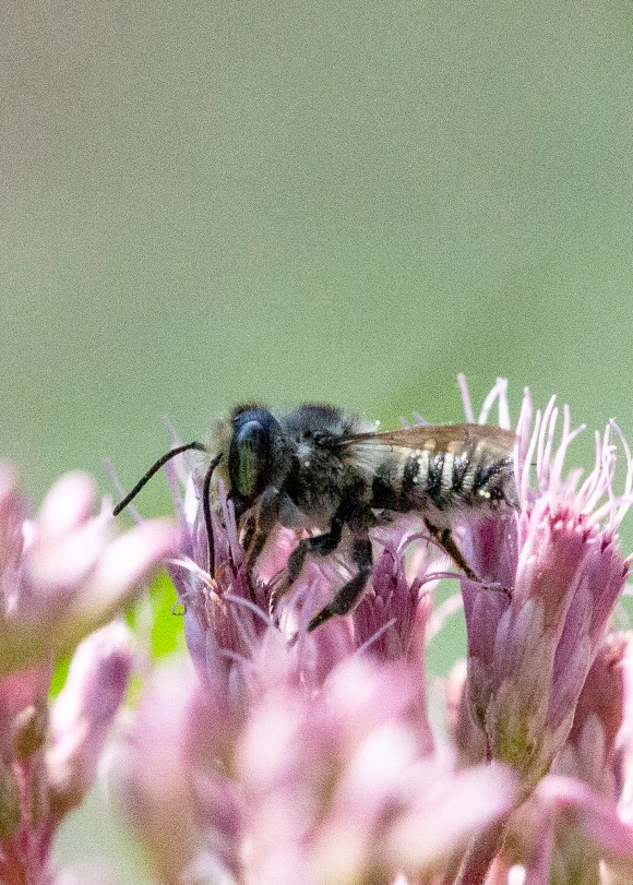 Melissodes denticulata flies from summer to early fall emerging in time for Ironweed’s bloom period. They carry pollen on a hairy structure on their back legs called a scopa. Look for Ironweed’s white pollen on their scopa, bodies and faces. 1,2