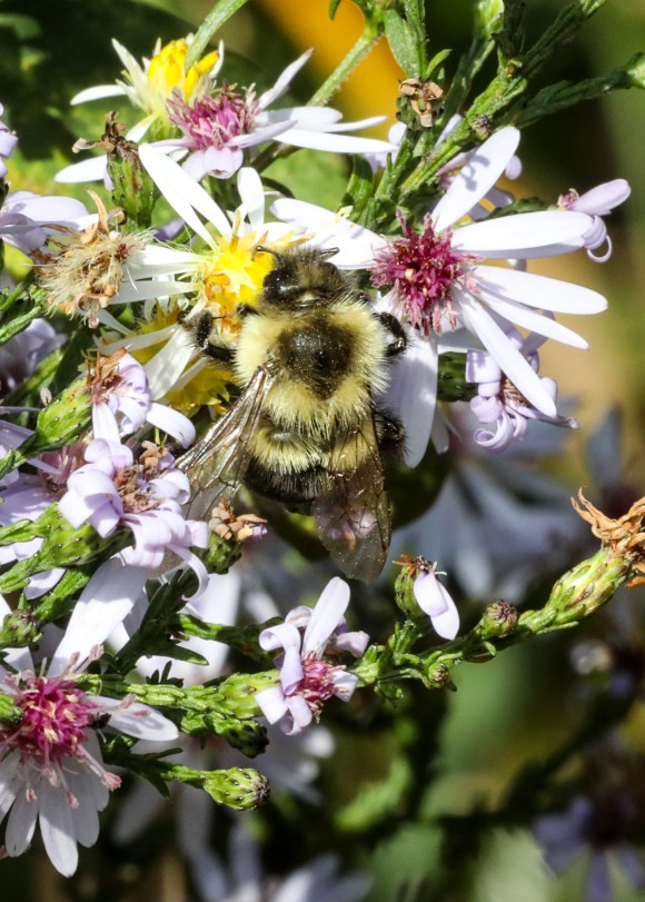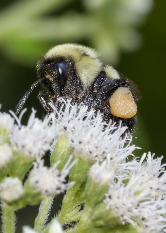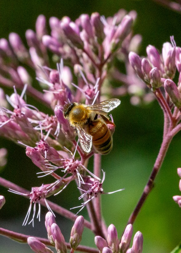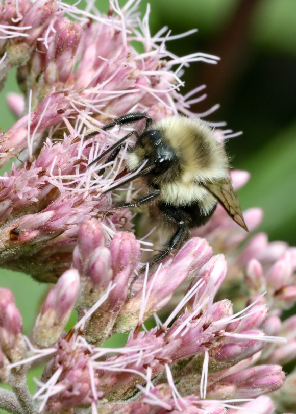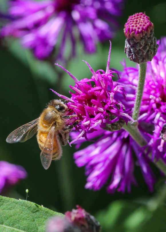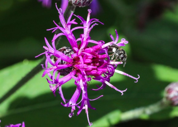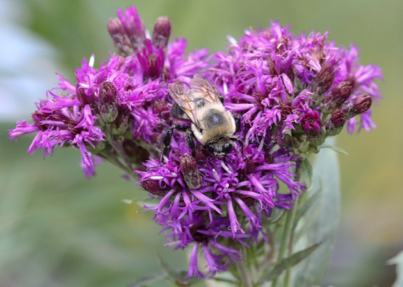 Bees gather pollen and nectar from Ironweed. These bee visitors include Bumblebees (Bombus spp.),