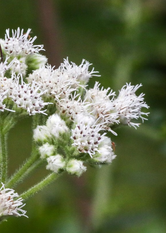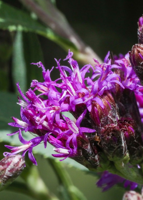 Vernonia missurica’s blossoms don’t have ray florets. This means no petals. Like Sweet Joe-Pye Weed (Eutrochium purpureum, https://wildthingsinthegarden.wordpress.com/wp-admin/post.php?post=2170&action=edit) and Boneset (Eupatorium perfoliatum, https://wildthingsinthe.garden/2025/05/30/a-white-frilly-flower/), these flowers have a fuzzy appearance. 30 to 60 disk florets make-up each bloom.4,5,6,9