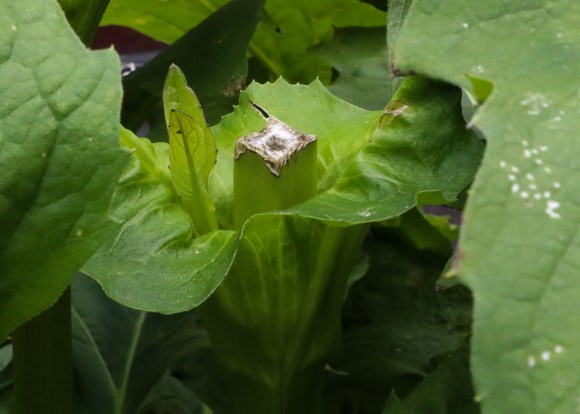 Females lay eggs one at time on plant leaves. When the larvae hatch, they use their silk to connect leaves together and make a shelter. This is usually at the top of the plant. The caterpillar stays in the tent eating and growing. 3,4