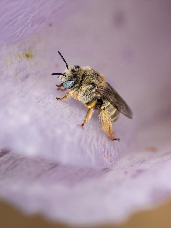 These bees are solitary, ground-nesting bees. Denticulate Long-Horned Bees line their nests with a waxy substance from their Dufour’s gland. Located near the ovipositor, the Dufour’s gland discharges pheromones and secretions. Bees mix secretions with food and/or use them to waterproof their nests. M. denticulata’s young overwinter in the nest. 1,2