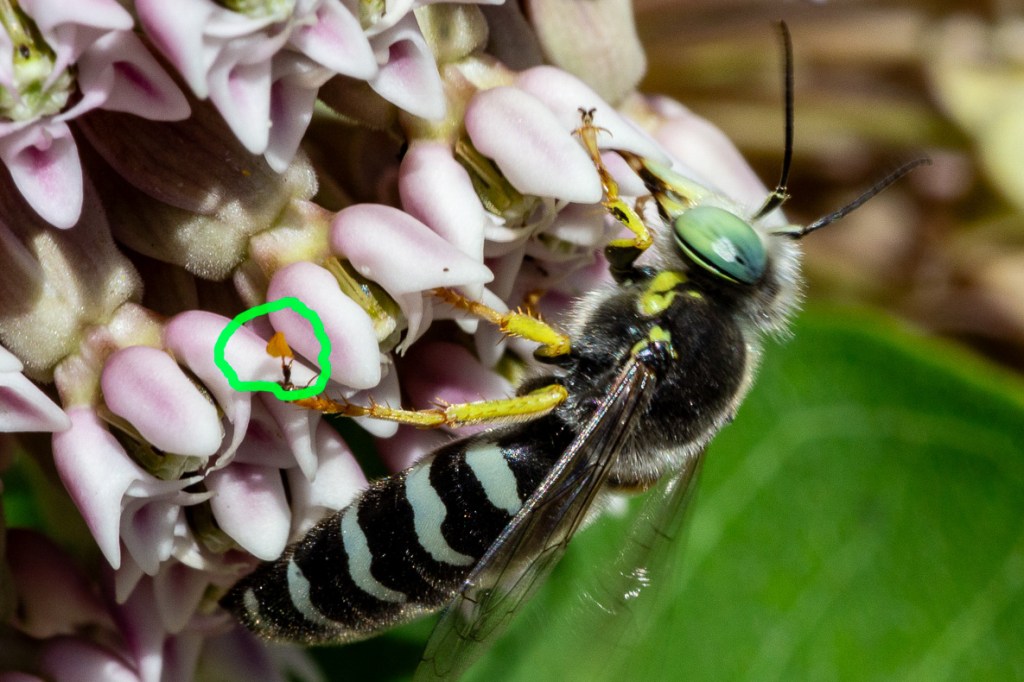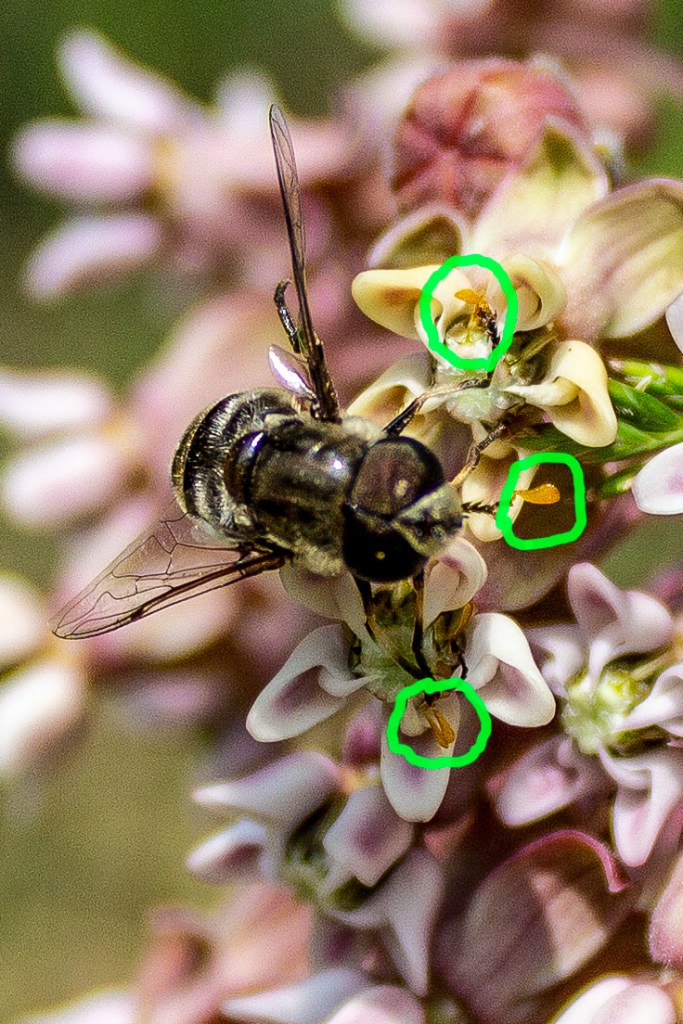 Melissodes denticulata flies from summer to early fall emerging in time for Ironweed’s bloom period. They carry pollen on a hairy structure on their back legs called a scopa. Look for Ironweed’s white pollen on their scopa, bodies and faces. 1,2